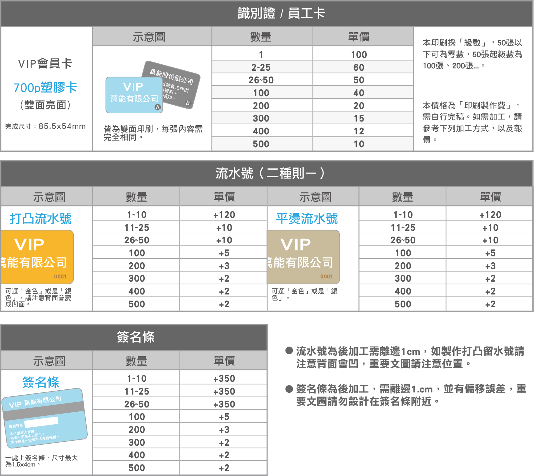 2.本產品分成,印刷與後加工(打流水號、簽名條…)二部分。